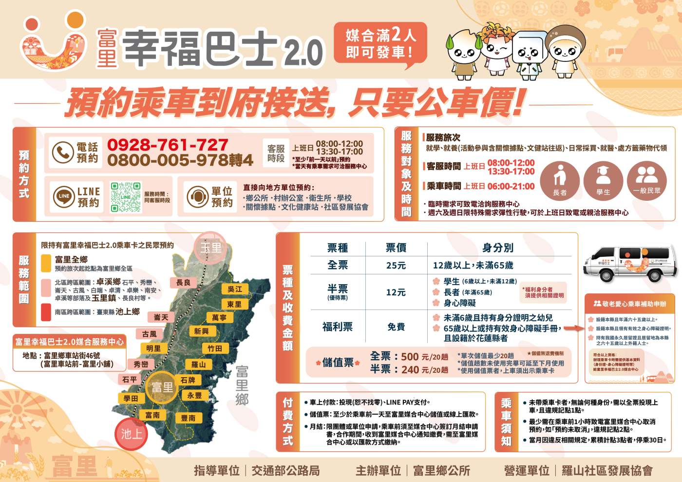 花蓮縣政府表示,富里幸福巴士車輛已全面升級,包含車身識別統一、車內外監視器、酒測系統等,讓乘客搭乘更安心。未來也將持續結合地方文化與交通服務,透過創新設計與貼心細節,讓「幸福」不只是移動的工具,更是一種生活的態度與社區的溫度。