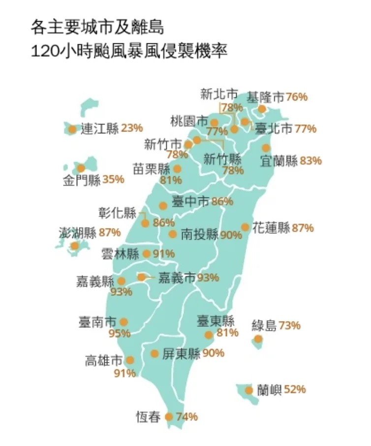 根據氣象署公布的暴風圈侵襲機率,苗栗縣81%、台中市86%、彰化縣86%、南投縣90%、雲林縣91%、嘉義市與嘉義縣皆達93%、台南市95%、高雄市91%、屏東縣90%、宜蘭縣83%、花蓮縣87%、台東縣81%、澎湖縣87%。雙北、基隆市、新竹縣市則介於76%至78%之間。
