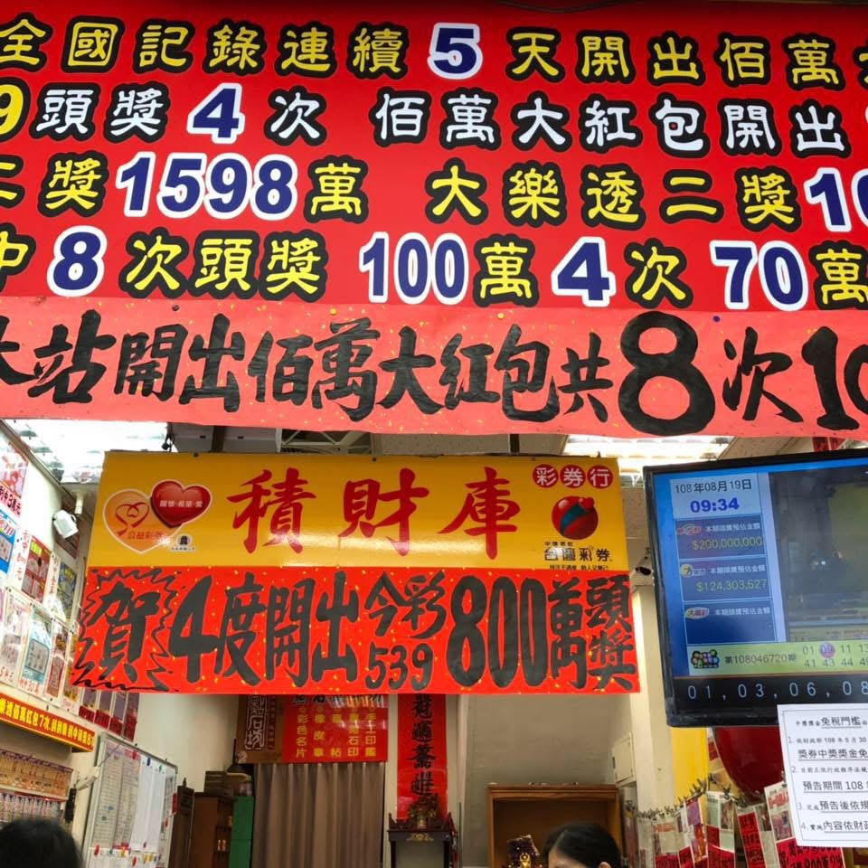 「積財庫彩券行」可說是花蓮的幸運地標。老闆娘吳桂秦表示,店面自23年前開始營業以來,中獎次數相當驚人。曾開出多次539頭獎、威力彩二獎1598萬元、大樂透二獎、大樂透百萬大紅包、大福彩刮刮樂頭獎等。其中在2019年大年期間更是從初一開始連續五天開出今彩539頭獎,旺到不行,合計開出、刮出獎金近億元之多。