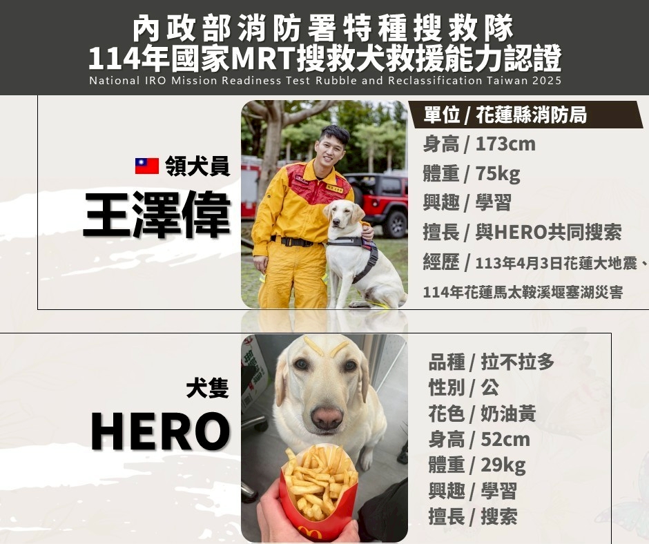 花蓮縣消防局表示,本次 MRT 測驗由領犬員王澤偉及搜救犬 HERO、邱楷紘及搜救犬 FANCY 共同參加,其中 HERO 順利通過認證並取得國際輪值資格,不僅是領犬員與搜救犬長期努力的成果,更代表花蓮縣整體救災能量再度升級。在氣候日漸極端的侵襲下,消防局強調將持續以最堅實的專業守護花蓮鄉親安全。