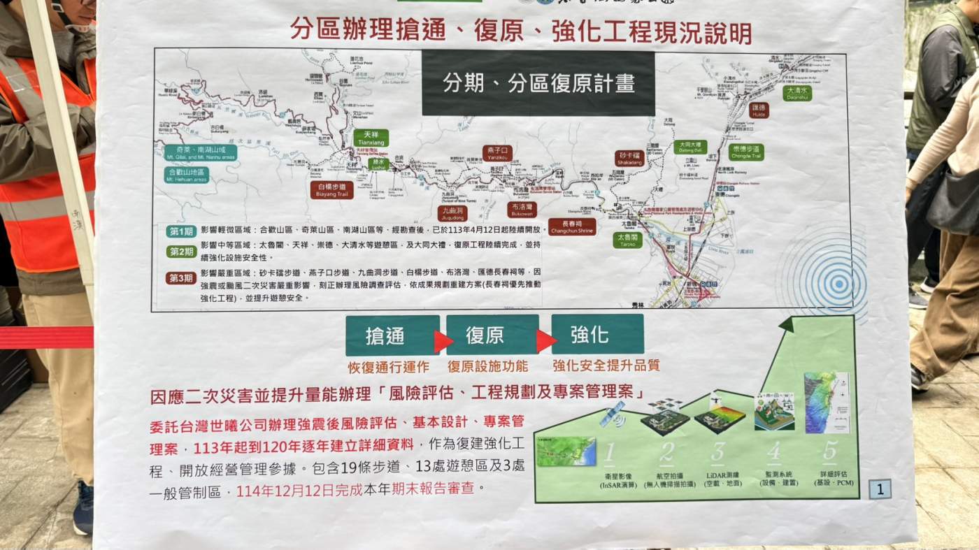 除了公路局進度超前的明隧道工程外,花蓮縣觀光處長余明勳代表在地業者發聲,指出長春祠是目前修復條件最優、最具吸引力的景點,期盼中央儘速排除安全疑慮,將長春祠作為帶領觀光客重返花蓮的首個指標據點。