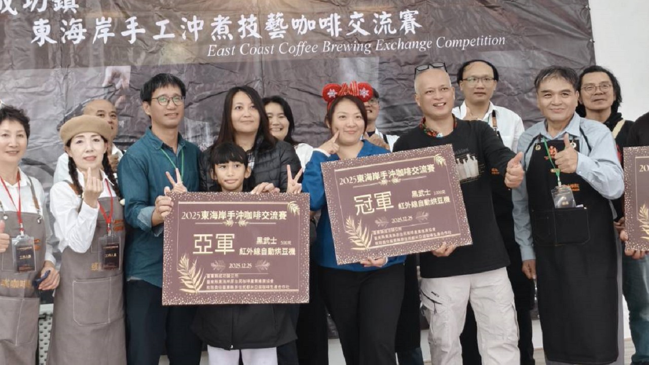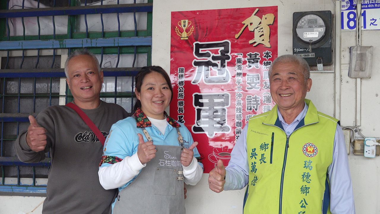花蓮縣瑞穗鄉咖啡產業再傳捷報!在地農友黃雯詩日前參加於臺東縣成功鎮舉辦的「2025 年東海岸手工沖煮技藝咖啡交流賽」,憑藉對水溫、研磨度及沖煮節奏的細膩精準掌握,在眾多咖啡好手中脫穎而出,勇奪冠軍寶座。瑞穗鄉長吳萬德於昨(12) 日率領公所團隊,親自前往黃雯詩經營的「瑞穗石柱有機咖啡」張貼紅榜,肯定其以卓越技藝將瑞穗精品咖啡推向國際舞台的努力,也為瑞穗咖啡品牌化注入一劑強心針。
