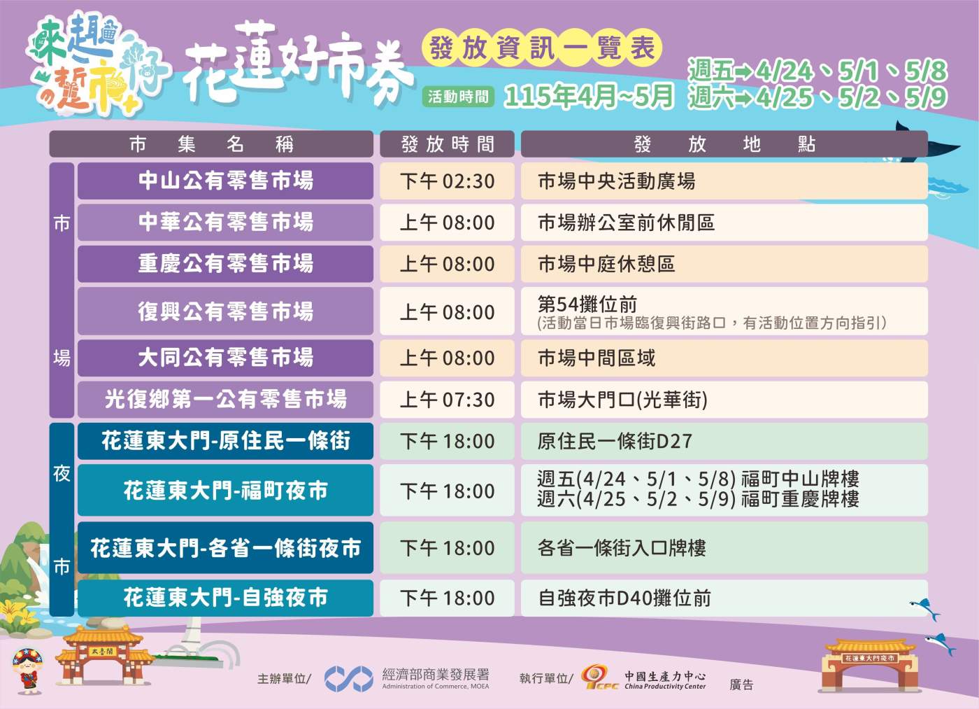 經濟部商業發展署為加速花蓮地區市集從114年風災後的影響中復甦,於今日(4月24日)正式啟動「來趣・踅市仔–花蓮好市券」活動。活動串聯光復鄉等六處傳統市場及東大門四處夜市,自即日起至5月9日止,連續三週的週五與週六發放。
