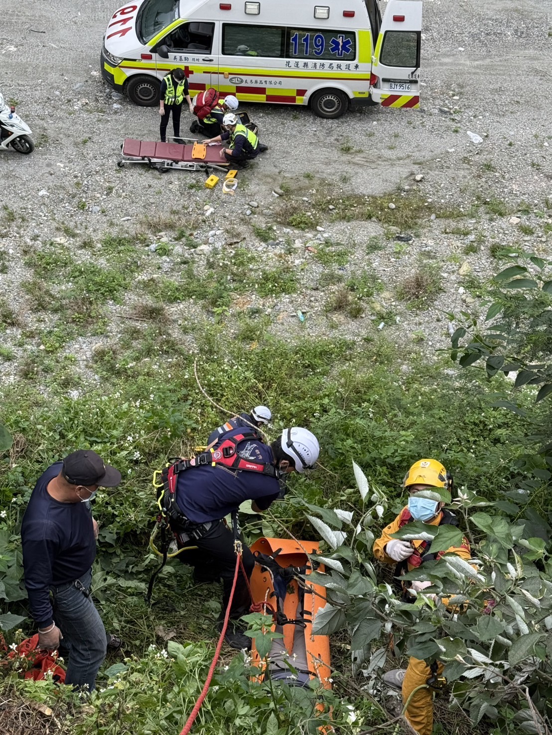 記者徐庭揚/花蓮報導花蓮縣秀林鄉銅蘭村今日下午發生一起嚴重墜落意外,一名年約 70 歲的女性於 14 時 26 分許,意外墜落至全家便利商店銅蘭門市旁的垂直邊坡,深度約達 5 公尺。搜救人員架設繩索下放成功接觸患者,目前該名婦女仍在醫院接受急救,相關墜落原因則交由轄區警方進一步釐清。