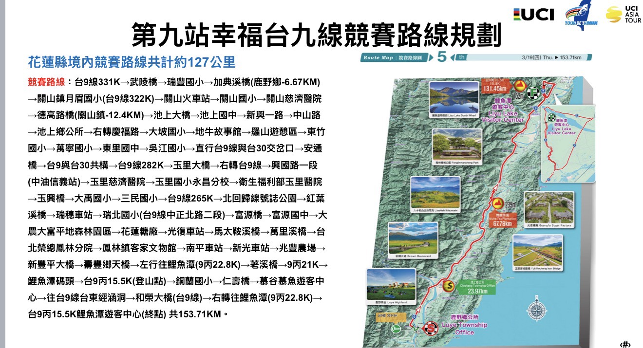 備受矚目的「319環台自行車國際賽事」即將於明日(3月19日)正式登場,參賽車隊預計於上午10時自臺東縣鹿野鄉出發,展開全長約153.71公里的長征。這場國際級賽事將沿著台9線一路北上,途經關山、池上、富里、玉里、瑞穗、鳳林及壽豐等地區,最終抵達終點站花蓮鯉魚潭。鳳林分局預估,車隊將自上午11時30分起陸續進入玉里、瑞穗及鳳林等轄區,沿線將經過三民國小、瑞穗車站、花蓮糖廠、鳳林客家文物館、南平車站、新光車站及兆豐農場等重要路段。(圖片/國際自由車環台公路大賽官網)