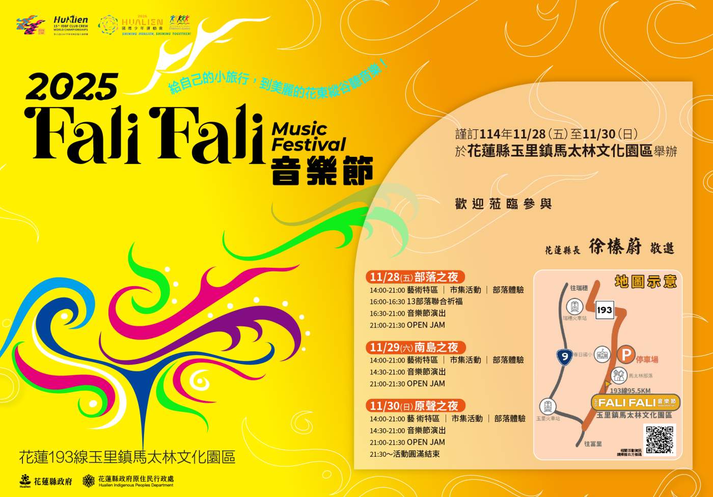 2025 Fali Fali音樂節由花蓮縣政府主辦,將於 114年11月28日(五)至11月30日(日) 在 花蓮縣玉里鎮馬太林文化園區 盛大登場。今年特別邀請享譽國際的旅英阿美族當代藝術家優席夫(Yosifu. Kacaw)擔任藝術總監,活動以「自然、文化、共感」三大主軸全面升級,預計成為花東地區最具文化厚度與藝術能量的盛事。