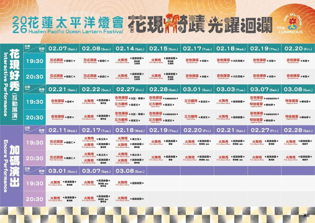 縣府特別邀請享譽國際的「起源劇團」(Origin Circus)與震撼戰鼓火舞高手「黃立芃」接力登場,讓烈火在夜空中劃出絢麗光軌,視覺震撼力十足。此外,花式調酒師「梁嘉仁」自開幕起便以結合特技與節奏的華麗拋接吸引爆棚人潮,為花蓮的夜晚增添微醺且浪漫的氛圍。這三大高張力的視覺盛宴,將在展期內每週末與連假的晚間 19:30 及 20:30 準時引爆日出大道。