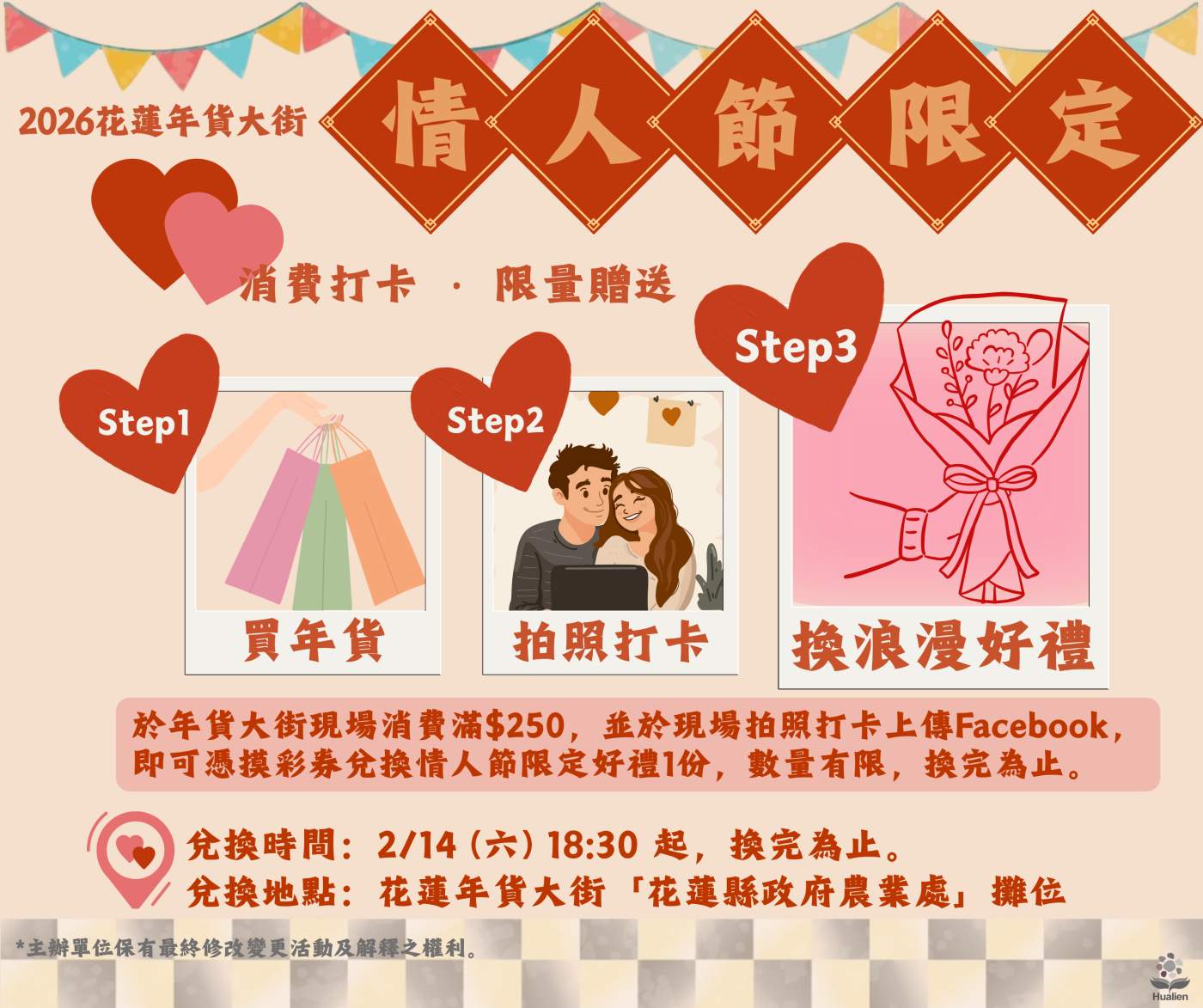 花蓮「2026幸福遊樂園」年貨大街自2月11日開跑後,在日出大道成功營造出邊逛市集邊玩樂園的獨特氛圍,短短三天內便吸引超過2萬人次進場採買。適逢今(14)日西洋情人節,縣府特別針對戀人與家庭客群推出限時驚喜,農業處長陳淑雯表示,這份心意不僅是禮物,更是希望2026年春天為民眾留下專屬的溫暖回憶。