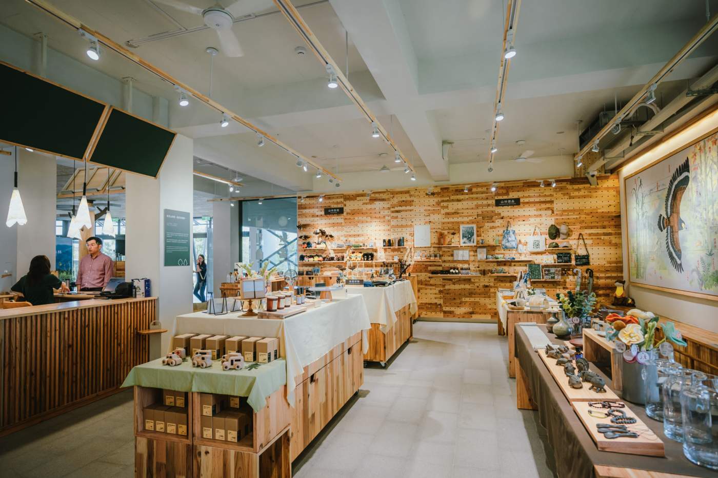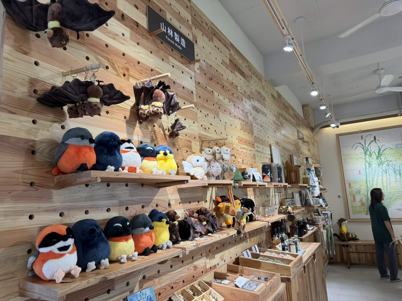 在空間與產品策劃上,選品店強調「五感體驗」與「少即是多」的極簡美學。牆面藝術特別邀請藝術家劉曉蕙創作,運用蔗渣手工紙描繪出平地森林從開墾到復育的歷史變遷。架上陳列的商品則精選自周邊社區的農產與工藝,包括具教育意義的木育玩具、充滿溫度的羊毛氈、植物繪本,以及各林管處的特色商品,將森林的經濟價值延伸至生活日用品中。此外,店內也提供野餐器具租借,鼓勵遊客帶上好物,直接走進森林深處體驗自然。