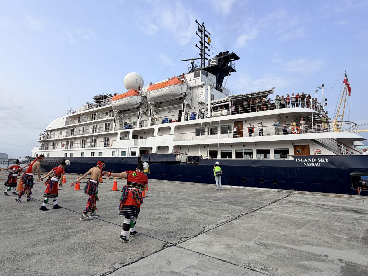 這艘巴哈馬籍的「島嶼天空」號總噸數約4,200噸,吃水深度僅4公尺,具備極高的航行靈活性,是定位高價位的精品探險型郵輪。縣府規畫原住民迎賓舞,並安排 4 名觀光大使現場諮詢,更由「台灣好行」提供每小時一班的便捷接駁,讓旅客能輕鬆往返市區。岸上觀光則出動 3 輛專車,行程涵蓋壯麗的太魯閣國家公園、具歷史底蘊的慶修院與松園別館、展現宗教美學的港天宮,以及震撼感十足的阿勒菲斯原住民舞蹈表演,讓國際旅客在短暫靠泊中印象深刻。