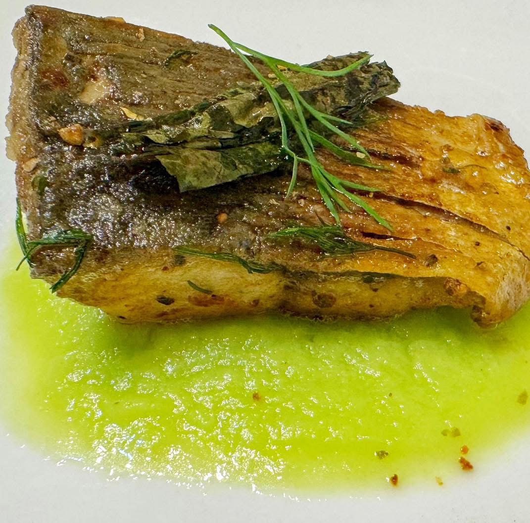 以一月主題「鯖魚」為例,主廚曾璽文特別挑選了冬季油脂最豐厚、風味最佳的「花腹鯖」,並運用熟成與「一夜干」的工法,在鎖住鮮味的同時確保魚肉口感穩定。在料理設計上,餐廳也落實了全食物利用與減少浪費的原則,將配菜葉片完整運用,回應當代餐飲對環境議題的關注。選擇鯖魚更有其環境深意:由於鯖魚生長快、族群穩定,且位於海洋食物鏈較底層,在正確產季選擇食用這類魚種,能有效降低對其他高生態壓力魚類的依賴,讓飲食行為直接成為守護海洋的一環。
