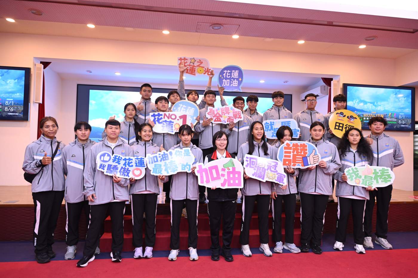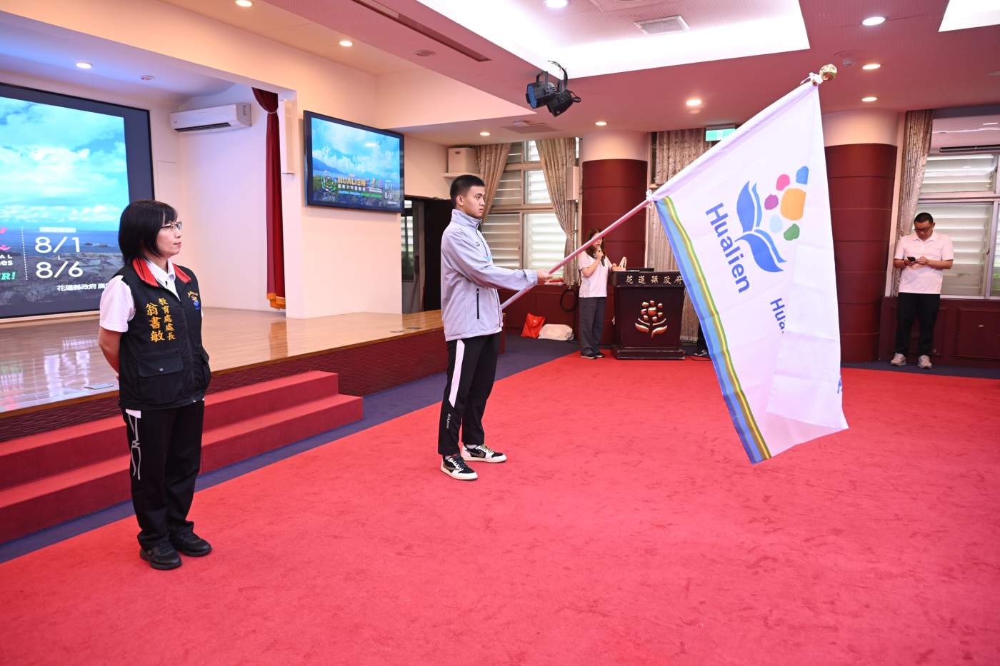 記者徐庭揚/花蓮報導 2026年全國中等學校運動會將於本月18日在嘉義縣揭幕,花蓮縣代表隊今日在縣府大禮堂舉行授旗典禮,花蓮縣政府教育處處長翁書敏代表縣長徐榛蔚將象徵「太平洋曙光」的縣旗交至選手手中,為即將出征的557名代表隊成員加油打氣。今年花蓮代表隊規模龐大,參賽項目橫跨田徑、舉重、空手道、輕艇等十三項運動種類,展現出花蓮作為體育大縣的深厚實力,目標是力拼超越去年十八面金牌的輝煌戰績,再創花蓮體壇高峰。