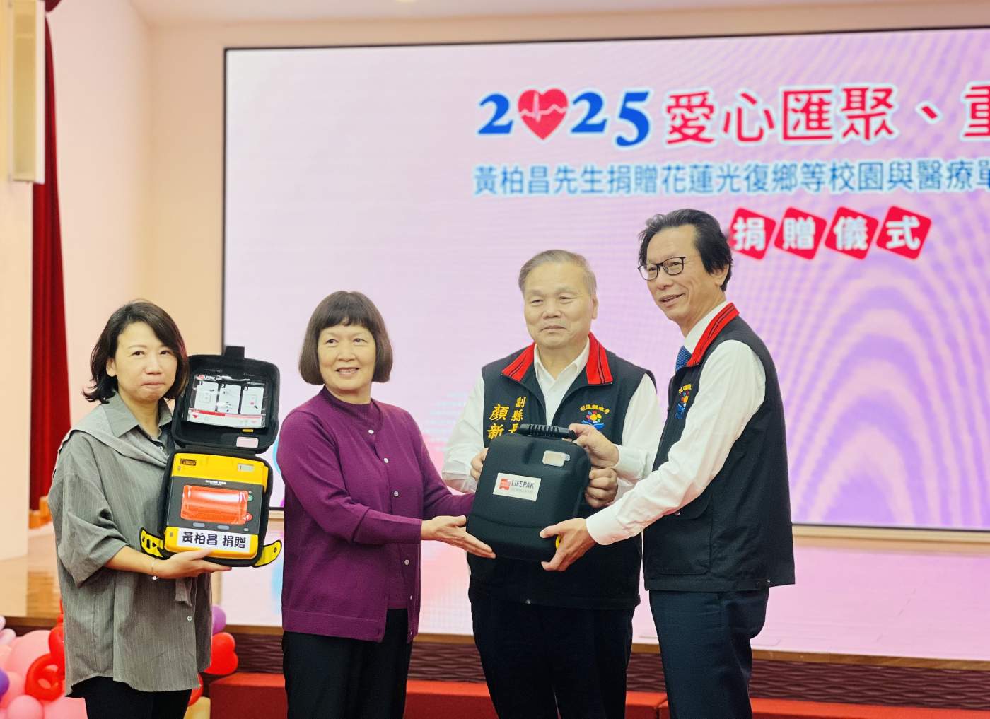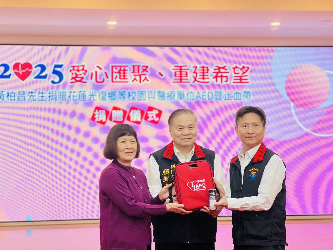 光復堰塞湖災害後,各界愛心持續湧入。善心企業家黃柏昌先生響應厚生基金會今(25)日捐贈花蓮社區急救設備,包括14台AED、5台高階AED及14條戰傷救護止血帶,分送至光復鄉學校、基層醫療機構、教會及其他偏鄉學校。捐贈儀式由副縣長顏新章代表受贈並回贈感謝狀,與會貴賓包括捐贈者黃柏昌之母陳雪、凱樂斯公司代表、衛生局長朱家祥、教育處副處長白鴻儀等,共同見證善舉。