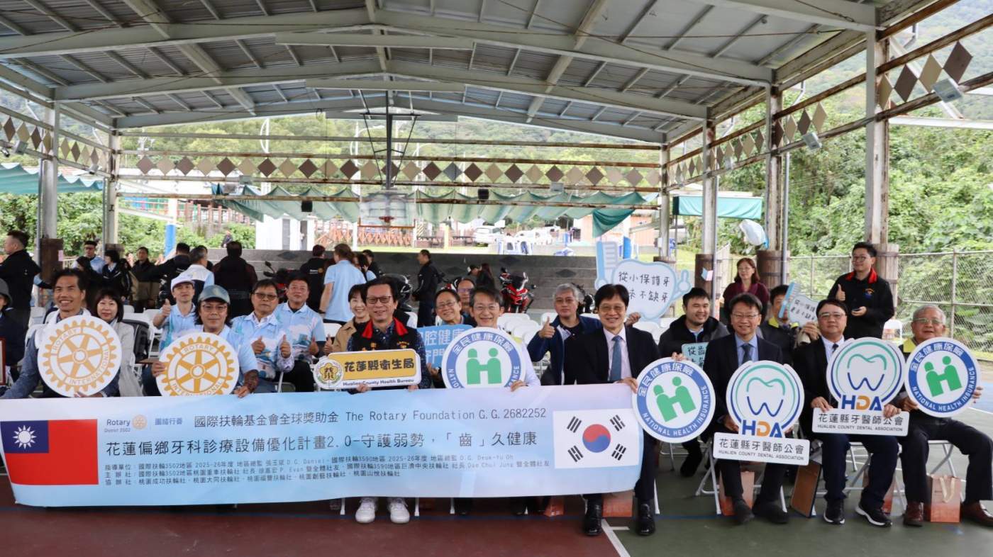 為縮短城鄉醫療落差,花蓮縣衛生局與牙醫師公會積極爭取民間資源,獲國際扶輪 3502 地區(桃園重車扶輪社)慷慨捐贈 5 組全新牙科診療設備,並優化現有器材。捐贈儀式於7日下午在秀林鄉佳民多功能集會所溫馨舉行,由衛生局長朱家祥與扶輪社總監張玉斌共同見證這份跨越區域的愛心。這批獲國際扶輪基金會全球獎助金支持的設備,已分別進駐玉里、瑞穗、鳳林等地的校園牙醫站及衛生室,全面提升花蓮北中南偏鄉的口腔醫療服務可近性。