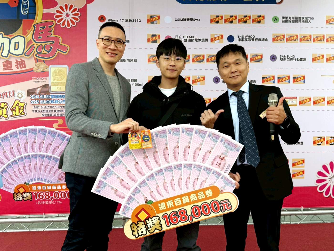遠百花蓮「好運加馬」春節福袋於今日熱鬧開獎,最大獎「16萬8000元遠東百貨商品券」由序號 0404 的藍先生幸運抽中。藍先生表示自己已連續5年購買遠百福袋,適逢新居落成,這筆商品券將計畫用於添購家具與家電。今年雖然福袋總量減少,但買氣依舊熱絡,大年初一凌晨5點便有支持者到場卡位,最後限量的100份名額在當天迅速額滿。其中連續4年排得頭香的曾先生,今年也順利搶到 001 號幸運序號,展現鐵粉的高度支持。