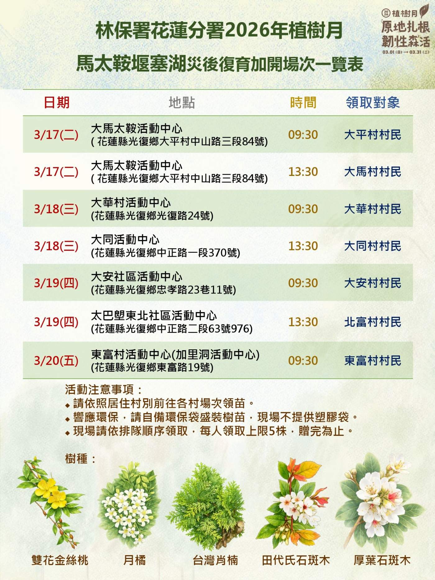 林業及自然保育署花蓮分署正式啟動115年度植樹月活動,今年以「原地扎根‧韌性森活」為核心精神,計畫在全縣由北至南舉辦共24場次的贈苗活動。其中最具指標性的區域植樹大場定於3月14日上午9時20分,在國立花蓮高級農業職業學校畜牧場舉行,現場除了簽署產學合作備忘錄(MOU),更針對去年受馬太鞍溪堰塞湖災情影響的光復鄉,特別安排7場次贈苗服務,以綠色能量協助受災鄉民重整家園。